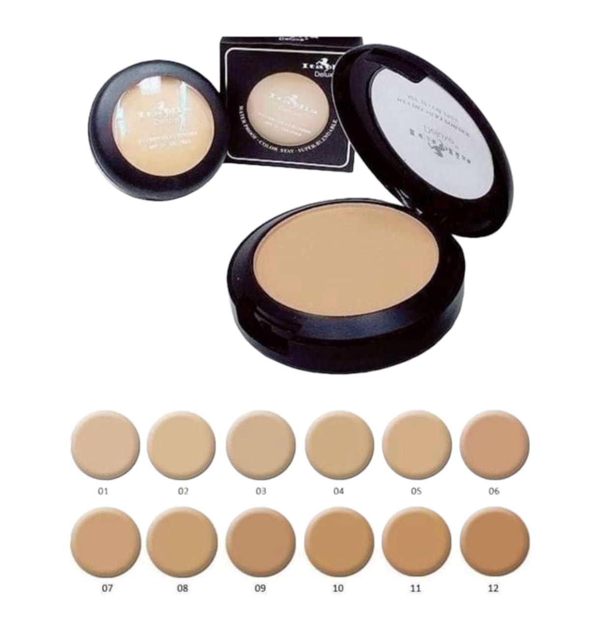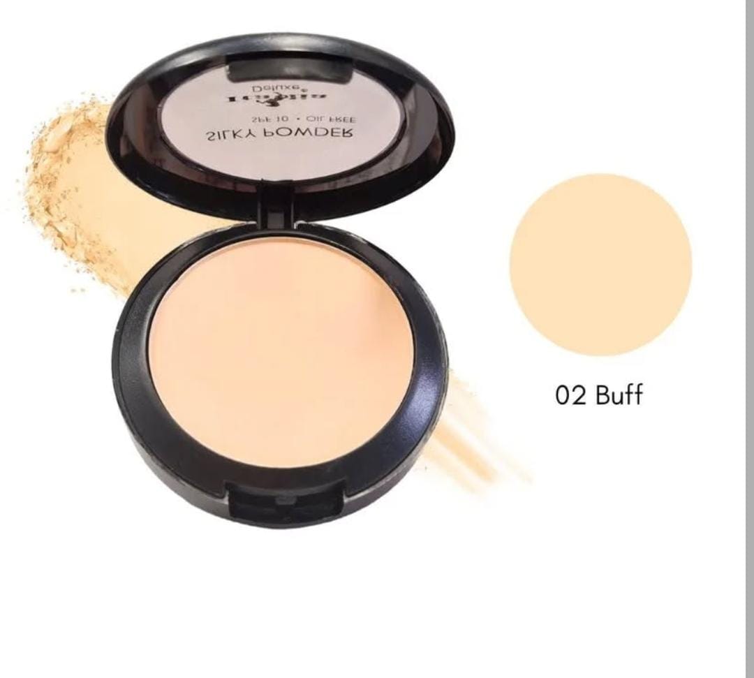 Polvo compacto, ligero, mate con cobertura ligera a media.